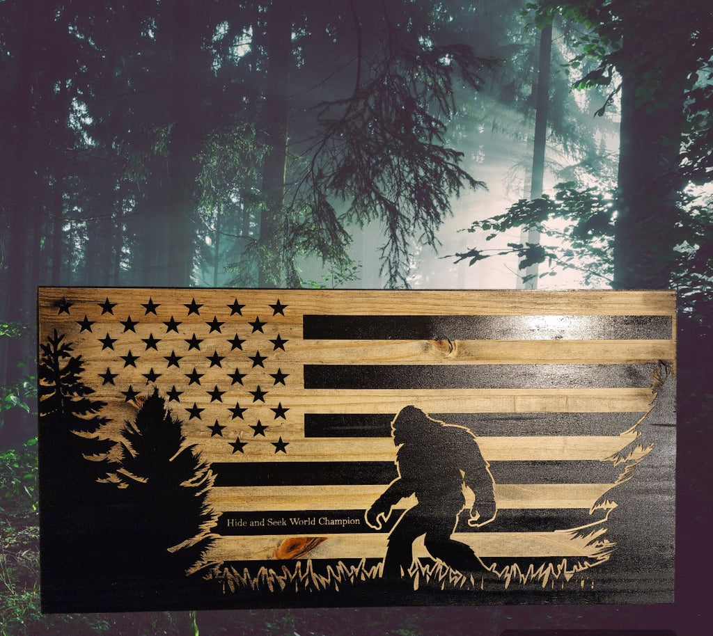 Add a touch of mystery and charm to your home decor with our handcrafted black and white flag featuring an intricately laser-engraved Bigfoot scene. Perfect for Sasquatch enthusiasts and those who appreciate unique, rustic decor.